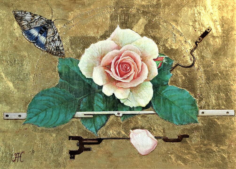 油彩、金箔/パネル、白亜地