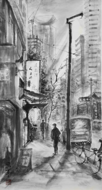 絵画(水墨)「都市空間 (コロナの街角2023)」佐藤鸞峯
